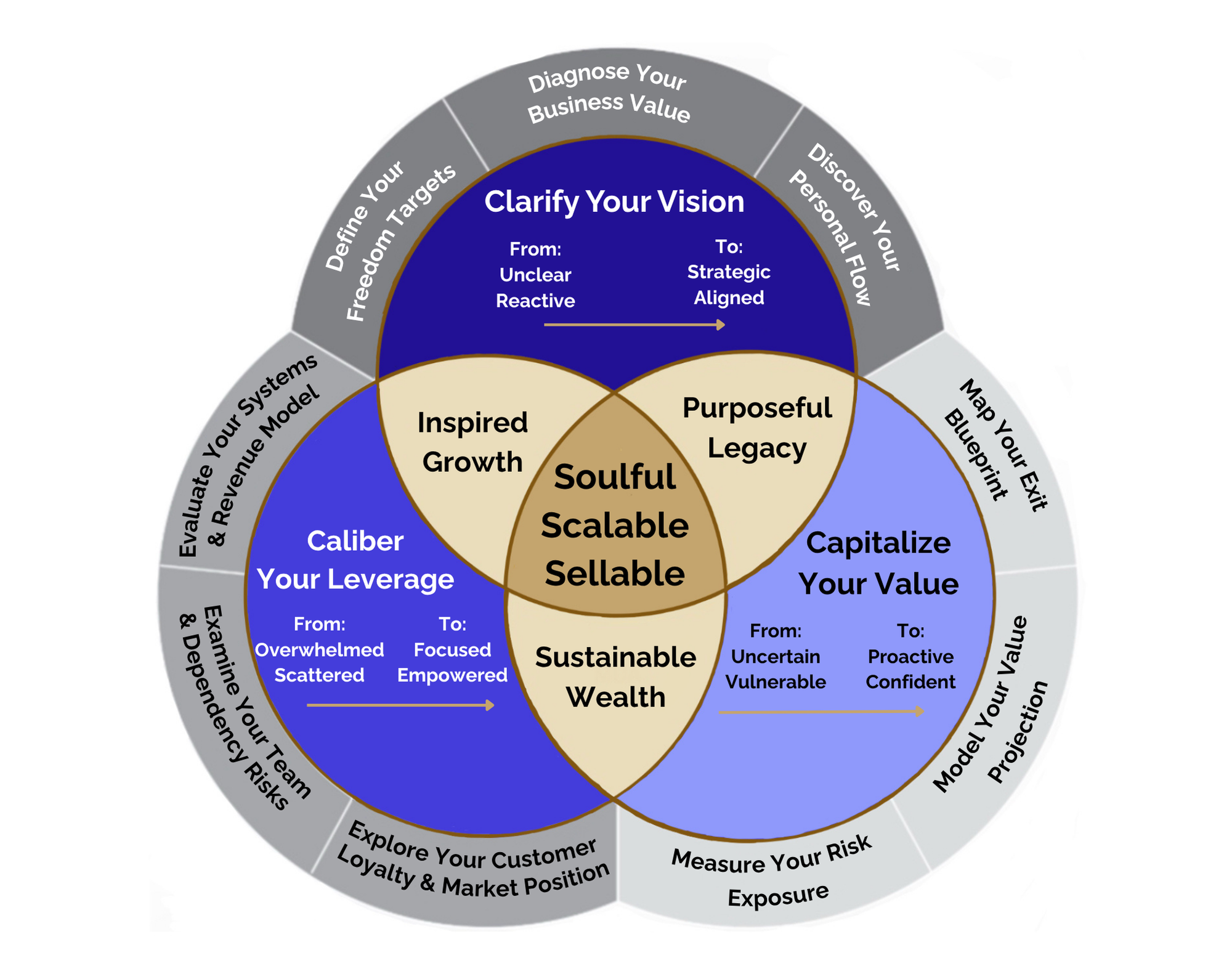 We provide the education, tools, and framework you need to build a business that's truly scalable, sellable, and soulful. Through our Academy, we help you align your natural talents with proven value-building principles, so you can create lasting worth while reclaiming your time and freedom.